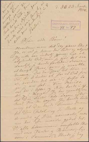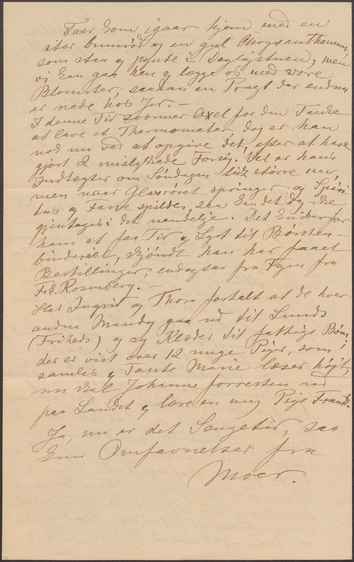 Hvordan mon det dog gaaer Eder! Ja, vi ved jo, hvem der leder og styrer! Jeg vilde saa inderlig gjerne sige et styrkende Ord, men jeg gjør det saa daarligt; jeg havde forleden skreven et langt Brev, som jeg maatte kassere. Der kan |dog| saa let blive en Tid, da I ønsker at faa et Ord fra os, hvordan det saa er, derfor tager jeg nu fat. – Fru Maribo var her i Aftes og Nils baade i Aftes og i Morges. Jeg har egentlig ventet Din Faster hele Dagen efter hvad Fru M. sagde. Jeg havde tænkt mig at Du havde skreven derom til Din Onkel og Fr. Bech og de andre af Dine nærmeste, men nu har Du maaske gjort det. Vi alle tilsammen omfatte Eder med vore Tanker og Bønner, ligesom i Sommer. – Havde jeg dog