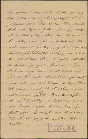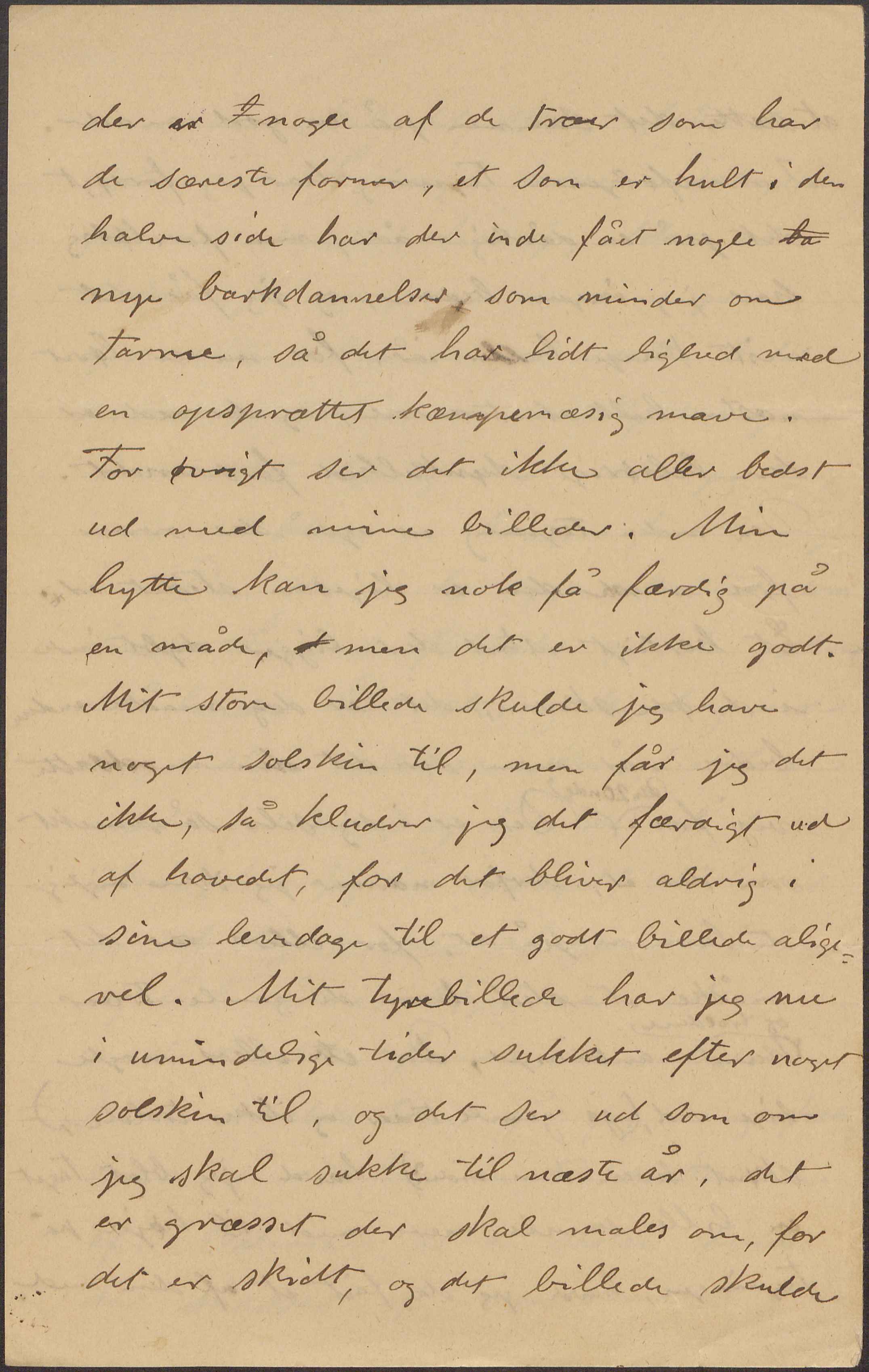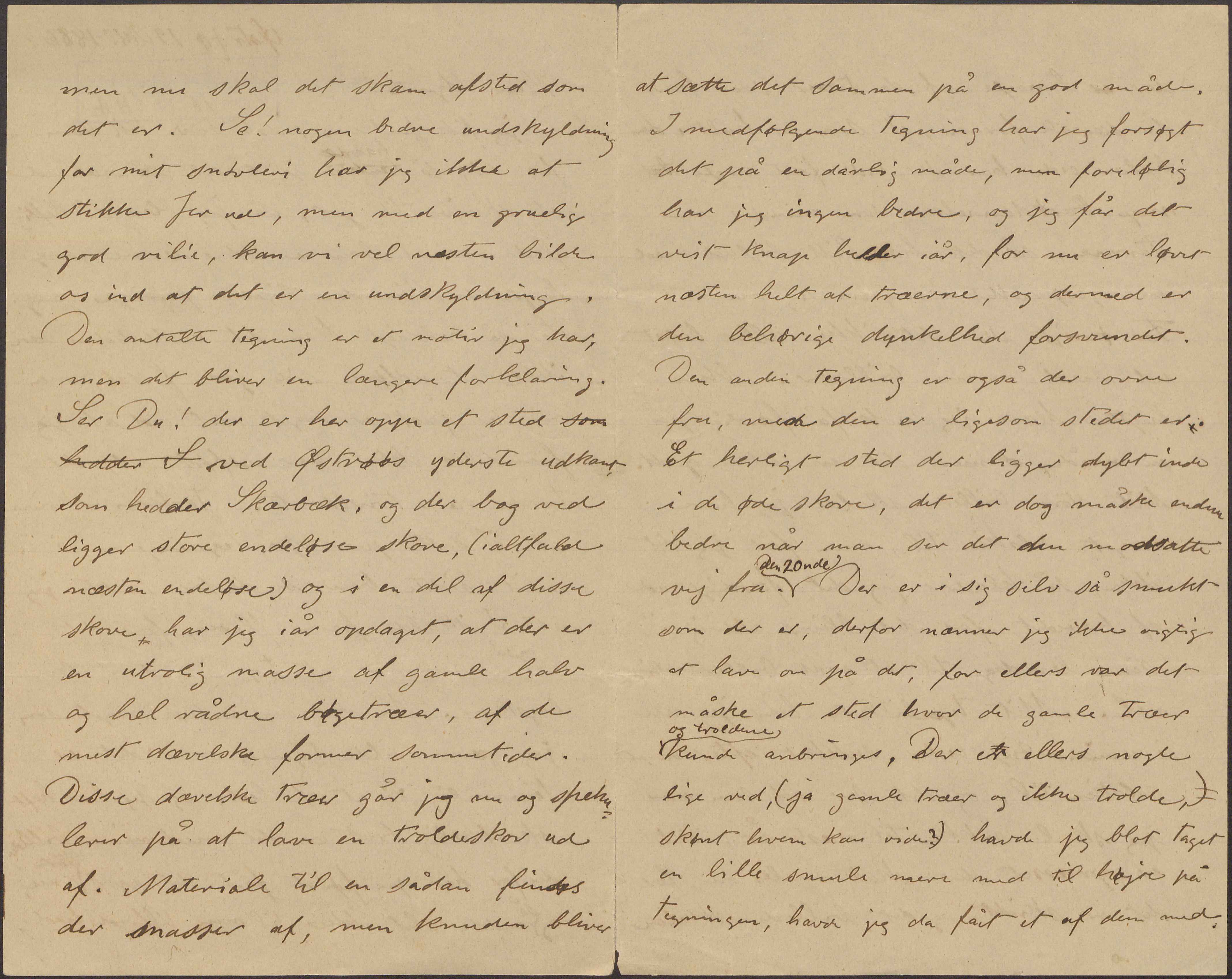 men nu skal det skam afsted som det er. Se! nogen bedre undskyldning for mit snøvleri har jeg ikke at stikke Jer ud, men med en gruelig god vilie, kan vi vel næste bilde os ind at det er en undskyldning. Den omtalte tegning er et motiv jeg har, men det bliver en længere forklaring. Ser Du! der er her oppe et sted som hedder I ved Østrøøs yderste udkant, som hedder Skærbæk, og der bag ved ligger store endeløse skove, (ialtfald næsten endeløse) og i en del af disse skove, har jeg iår opdaget, at der er en utrolig masse af gamle halv og hel rådne bøgetræer, af de mest dævelske former sommetider. Disse dævelske træer går jeg nu og spekulerer på at lave en troldeskov ud af. Materiale til en sådan findes der masser af, men knuden bliver