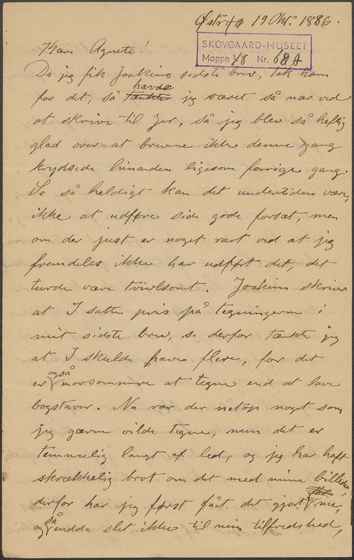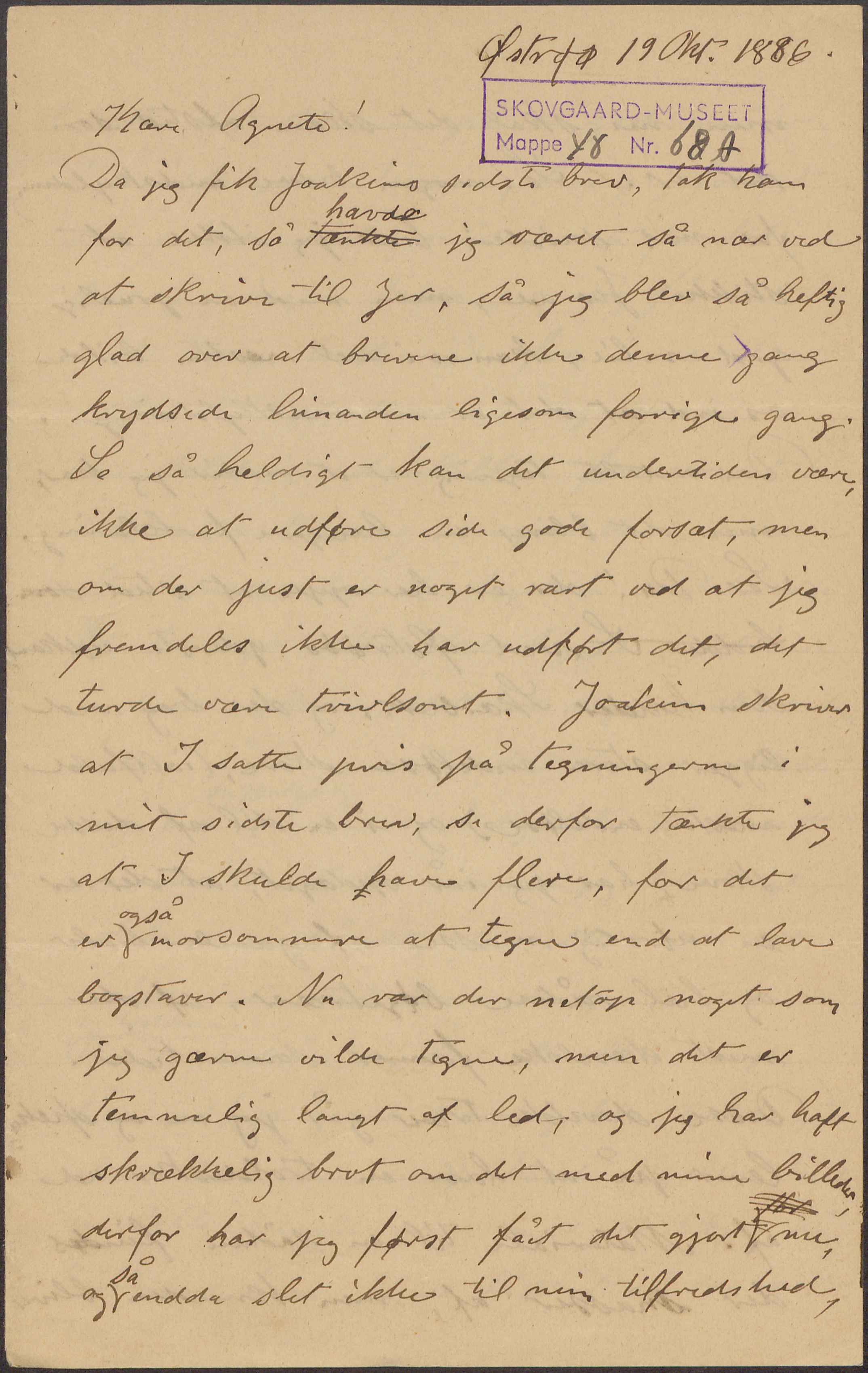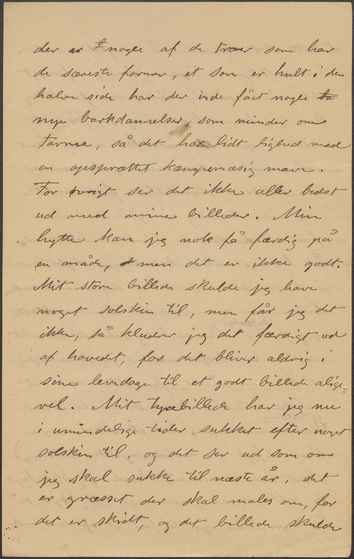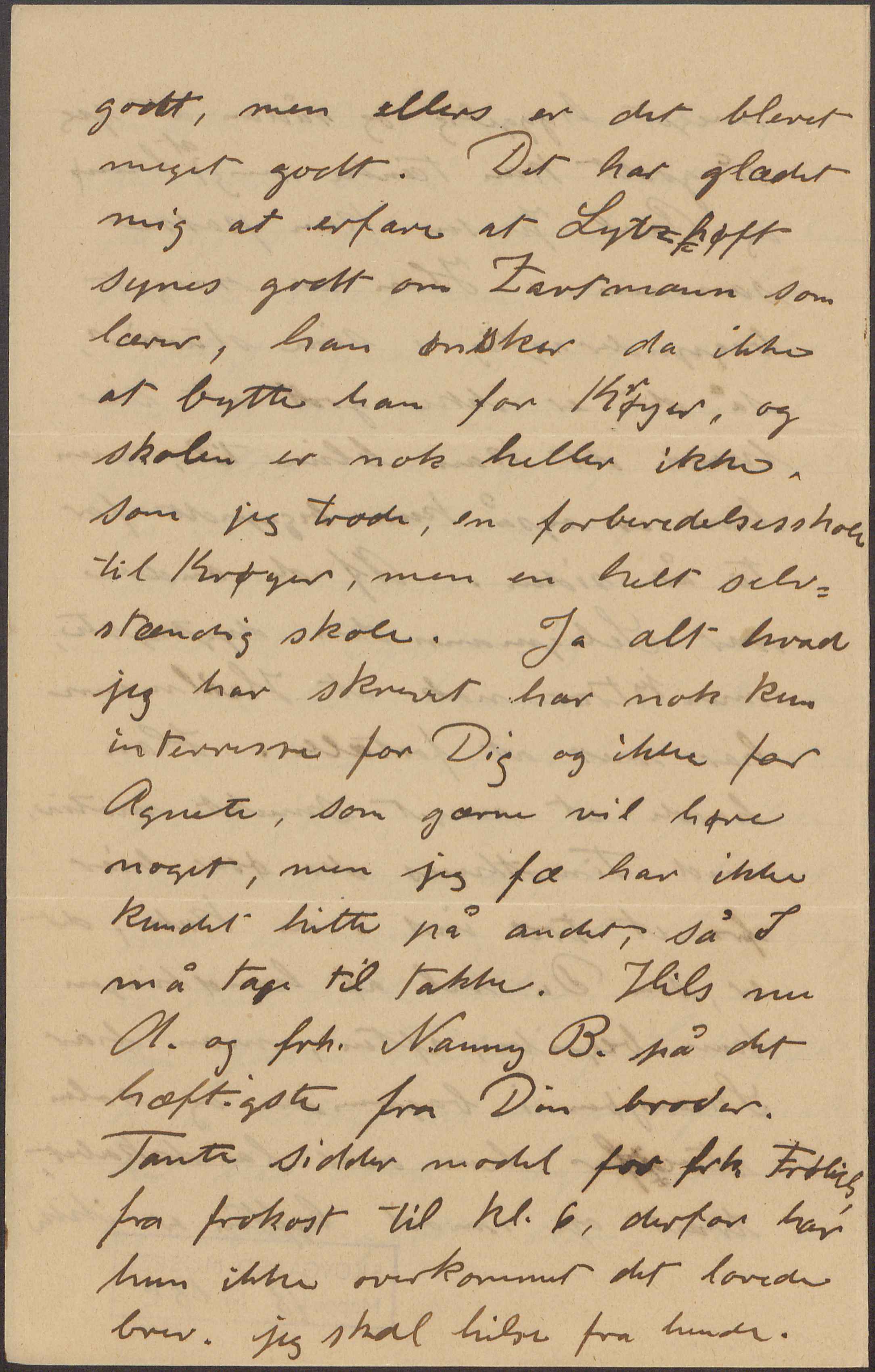 godt, men ellers er det blevet meget godt. Det har glædet mig at erfare at Lytzhøft synes godt om Zartmann som lærer, han ønsker da ikke at bytte ham for K|r|øyer, og skolen er nok heller ikke, som jeg troede, en forberedelsesskole til Krøyer, men en helt selvstændig skole. Ja alt hvad jeg har skrevet har nok kun interesse for Dig og ikke for Agnete, som gærne vil høre noget, men jeg fæ har ikke kundet hitte på andet, så I må tage til takke. Hils nu A. og frk. Nanny B. på det hæftigste fra Din broder. Tante sidder model for frk. Frølich, fra frokost til kl. 6, derfor har hun ikke overkommet det lovede brev. Jeg skal hilse fra hende.