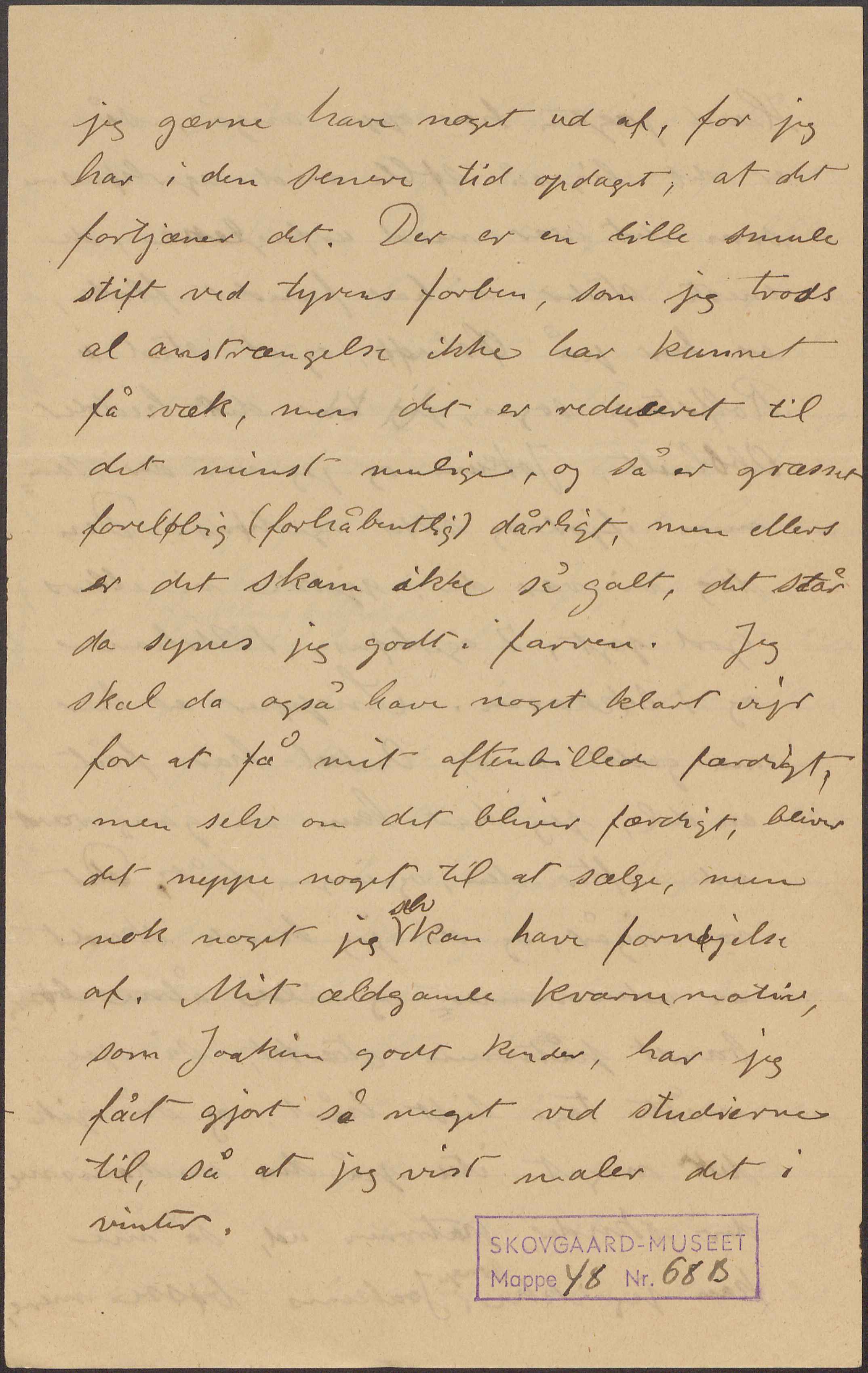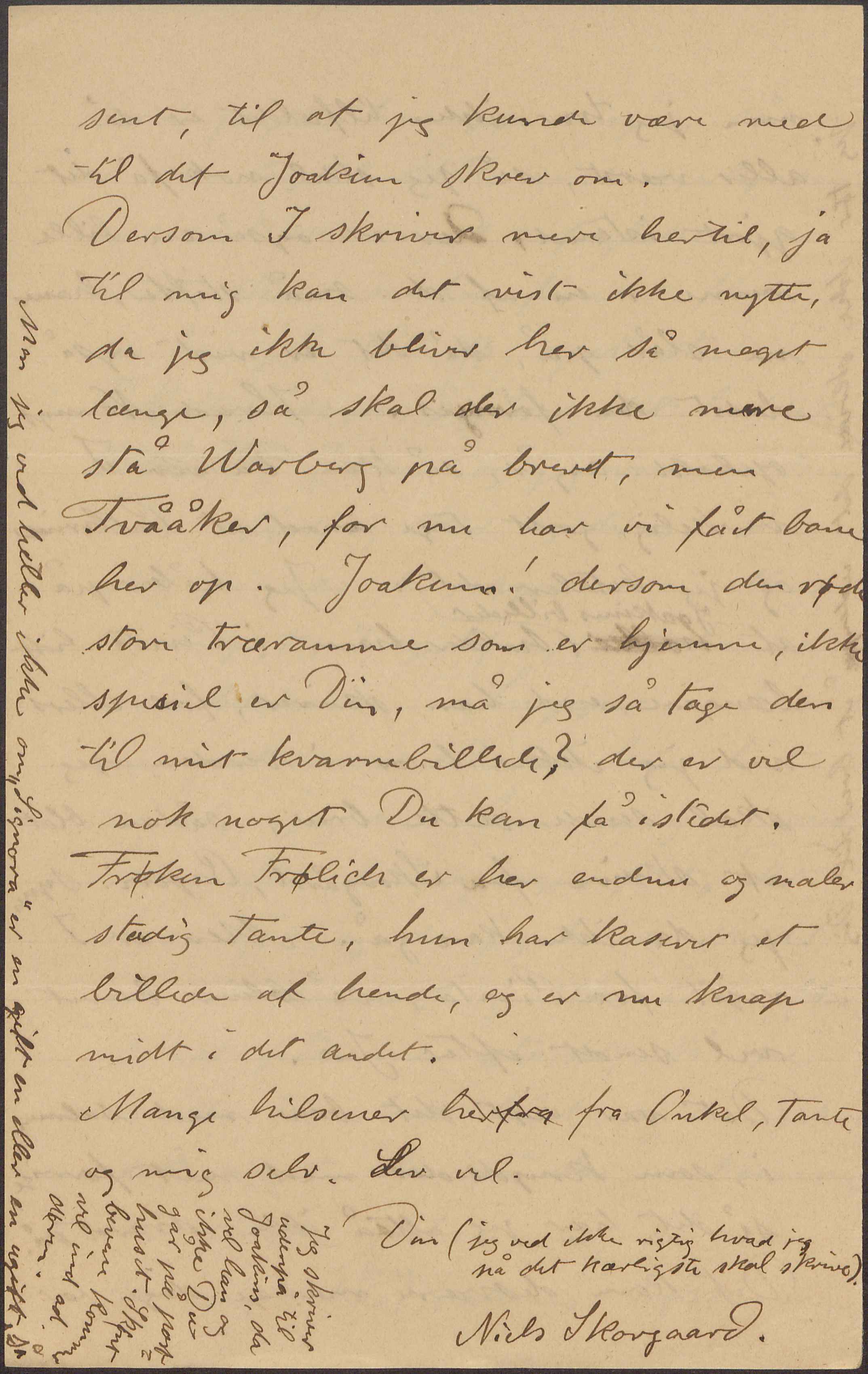 Dersom I skriver mere hertil, ja til mig kan det vist ikke nytte, da jeg ikke bliver her så meget længe, så skal der ikke mere stå Warberg på brevet, men Tvååker, for nu har vi fået bane her op. Joakim! dersom den røde store træramme som er hjemme, ikke speciel er Din, må jeg så tage den til mit [? Kvarrebillede]? der er vel nok noget Du kan få istedet. Frøken Frølich er her endnu og maler stadig tante, hun har kaseret et billede af hende, og er nu knap midt i det andet.