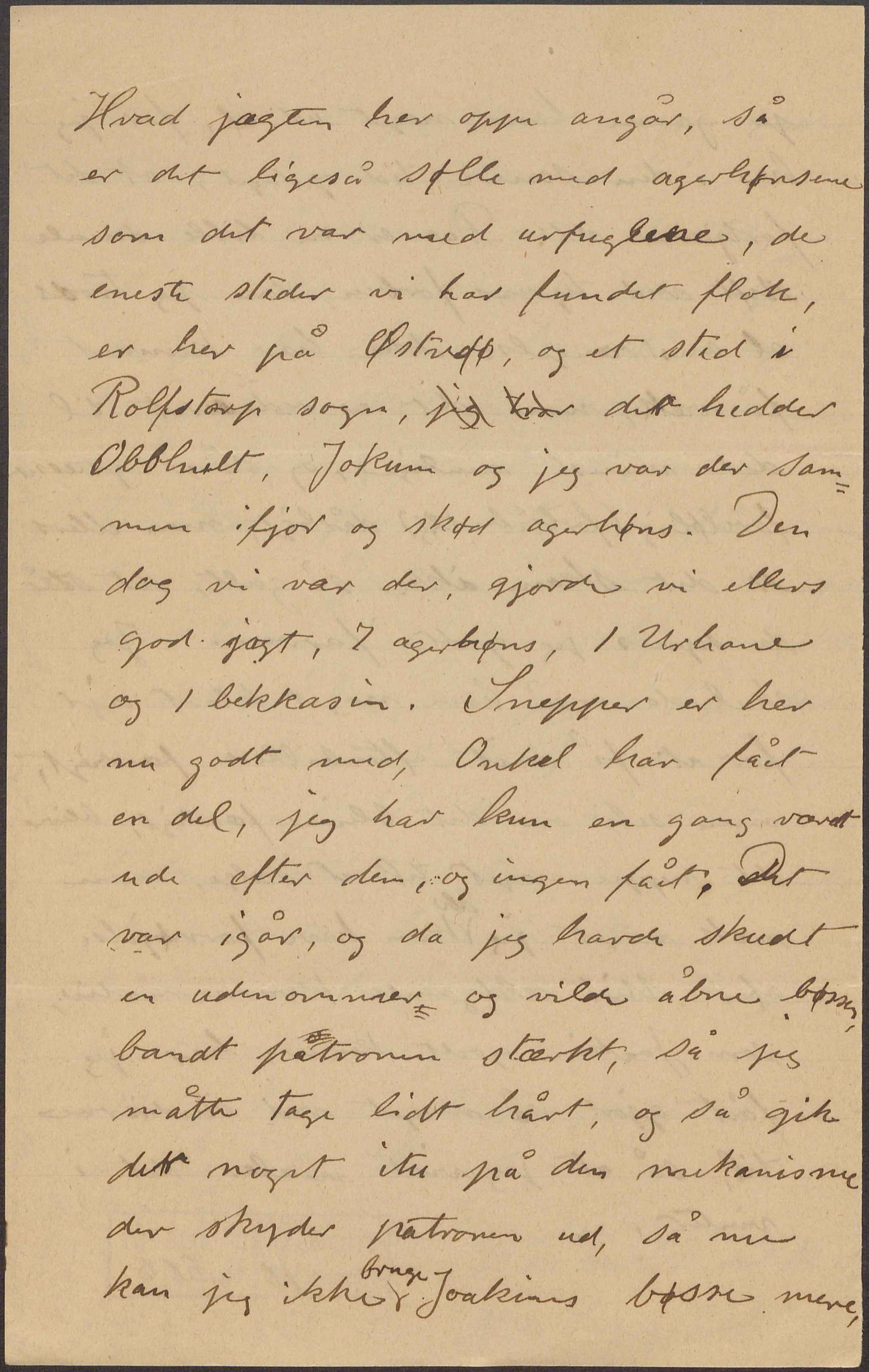 Hvad jagten her oppe angår, så er det ligeså sølle med agerhønsene som det var med urfuglene, de eneste steder vi har fundet flok, er her på Østrøø, og et sted i Rolfstorp sogn, jeg tror der hedder Obbhult, Jokum og jeg var der sammen ifjor og skød agerhøns. Den dag vi var der, gjorde vi ellers god jagt, 7 agerhøns, 1 Urhane og 1 bekkasin. Snepper er her nu godt med, Onkel har fået en del, jeg har kun en gang været ude efter dem, og ingen fået. Det var i går, og da jeg havde skudt en udenommer og vilde åbne bøssen, bandt patronen stærkt, så jeg måtte tage lidt hårt, og så gik der noget itu på den mekanisme der skyder patronen ud, så nu kan jeg ikke |bruge| Joakims bøsse mere,