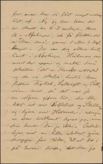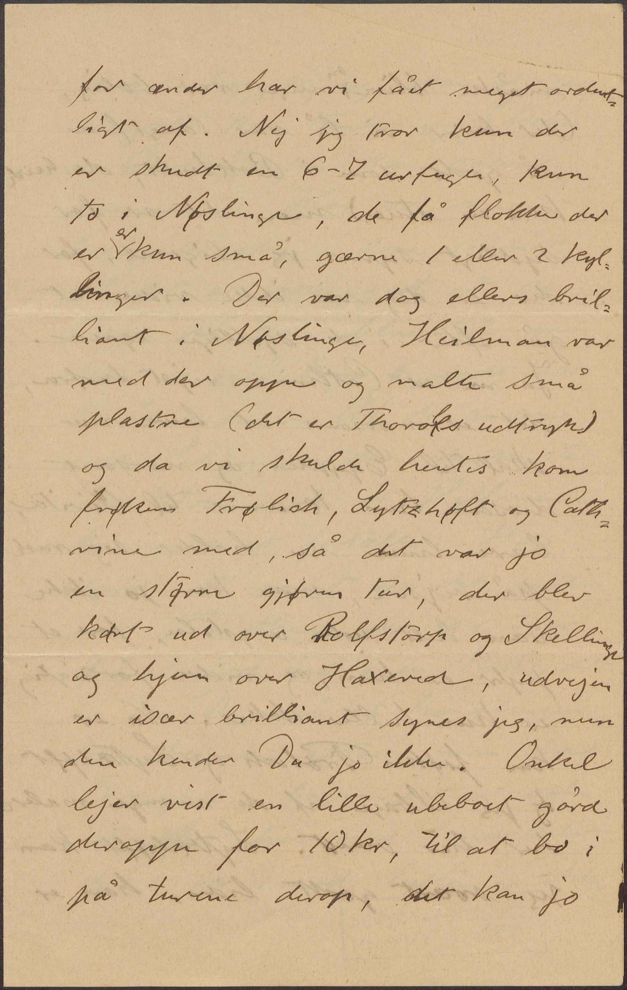 for ænder har vi fået meget ordentligt af. Nej jeg tror kun der er skudt en 6-7 urfugle, kun to i Nøslinge, de få flokke der er |er| kun små, gærne 1 eller 2 kyllinger. Der var dog ellers brilliant i Nøslinge, Heilman var med der oppe og malte små plastre (det er Thoro|l|fs udtryk) og da vi skulde hentes kom frøken Frølich, Lytzhøft og Cathrine med, så det var jo en større gjøren tur, der blev kørt ud over Rolfstorp og Skellinge og hjem over Haxered, udvejen er især brilliant synes jeg, men den kender Du jo ikke. Onkel lejer vist en lille ubeboet gård deroppe for 10 kr, til at bo i på turene derop, det kan jo