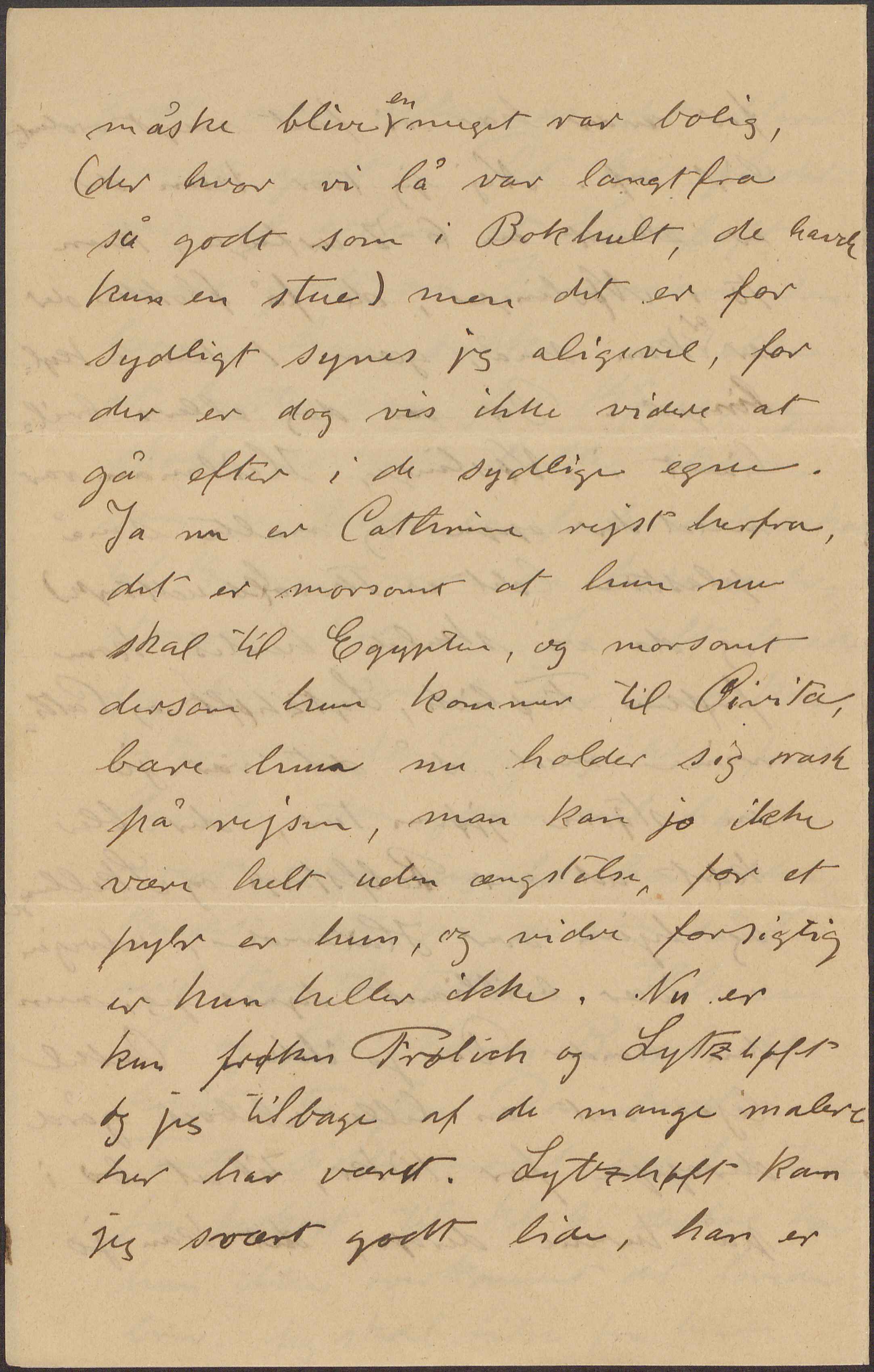 måske blive |en| meget rar bolig, (der hvor vi lå var langt fra så godt som i Bokhult, de havde kun en stue) men det er for sydligt synes jeg aligevel, for der er dog vis ikke videre at gå efter i de sydlige egne. Ja nu er Cathrine rejst herfra, det er morsomt at hun nu skal til Egypten, og morsomt dersom hun kommer til Civita, bare hun nu holder sig rask på rejsen, man kan jo ikke være helt uden ængstelse, for et pylr er hun, og videre forsigtig er hun heller ikke. Nu er kun frøken Frølich og Lytzhøft og jeg tilbage af de mange malere her har været. Lytzhøft kan jeg svært godt lide, han er