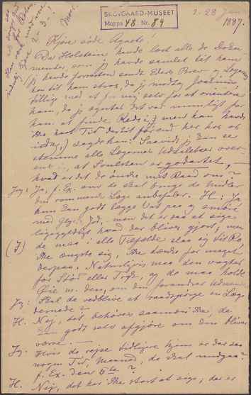 Da Holstein havde læst alle de Dokumenter, som jeg havde samlet til ham (jeg havde forresten sendt Eders Brev og Lægernes hen til ham strax, da jeg modtog Joakims, tillige med et fra mig selv for at orientere ham, da jeg syntes det var umuligt for ham at finde Rede i, men han havde ikke havt Tid dertil førend her hos os idag,) sagde han: Saavidt jeg kan se stemme alle Lægernes Udtalelser overens i, at Svulsten er godartet, - hvad er det de ønske mit Raad om?
