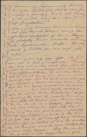 Faer var igaar 7 Q. oppe igaar, idag 2 Timer, men da han er meget svag i Benene har han endnu ikke været nede. Han befinder sig ret vel, undtagen naar han maa tage afførende Midler, el. naar han skyder det ud med at bruge dem, som vi ogsaa have forsøgt. For det meste sover han godt om Natten og Maden smager ham, men han tør kun spise meget smaa Portioner ad Gangen. Min Tid er dygtig optagen, som Du nok kan tænke, Netebasse! derfor skriver jeg ikke mere idag, maaske kan en anden sætte lidt Kryderi paa. Det er en urolig Dag i dag, Du ved det er Valgdag. Gud være med vort velsignede kjære lille Land! Endnu vil jeg kun sige, Gud ske Lov! at I slap ud af Iyzos Kløer, jeg haaber da ikke Kim vil give 100 Fr. for mere af hans vaklende Vrøvl. Gud være takket at han ikke snittede løs, det kunde maaske have ødelagt Kims og vores dejlige Agnete. – Slaa Eder nu til Ro og naar vi alle lægger Sagen i Guds