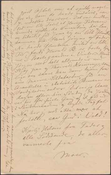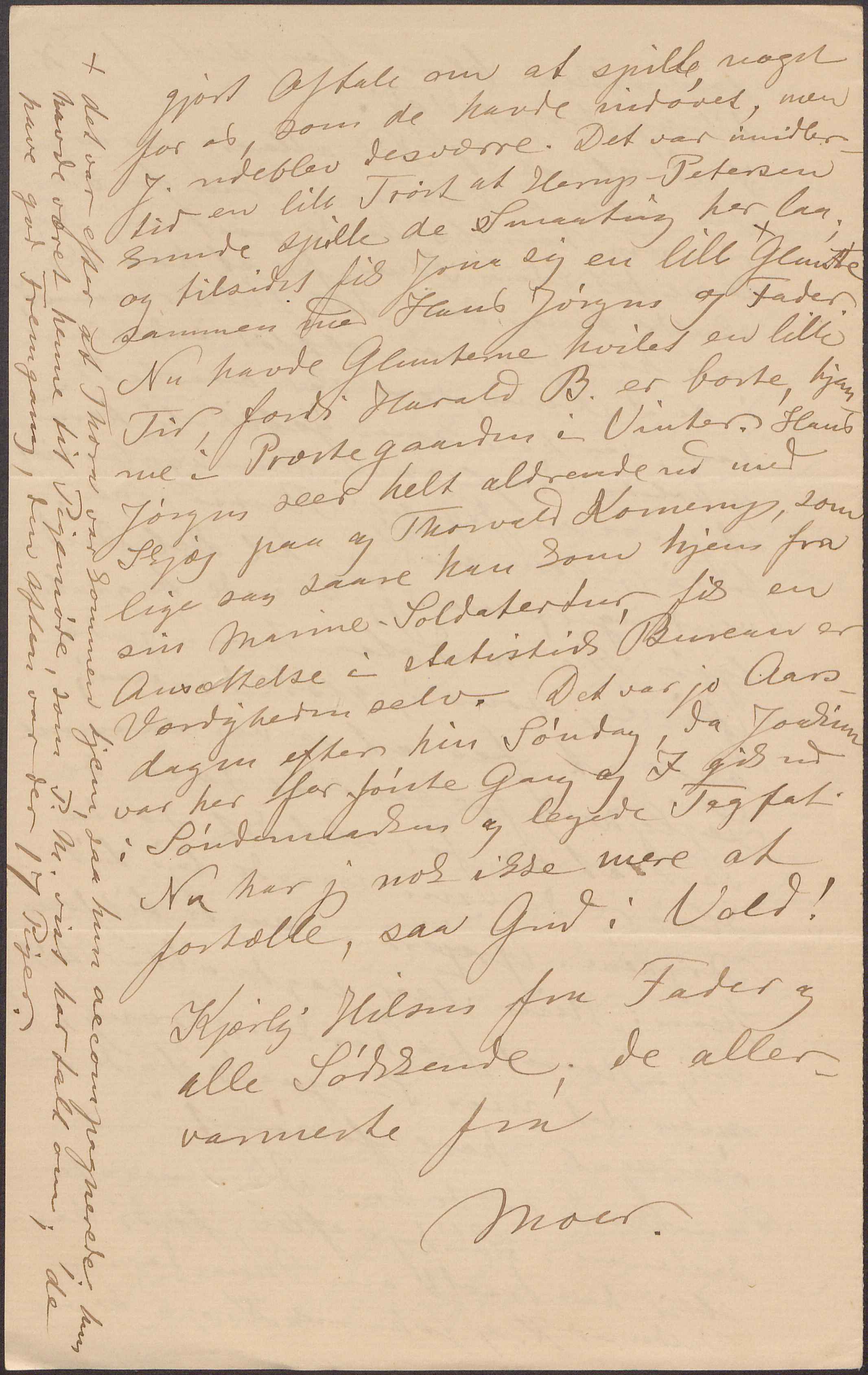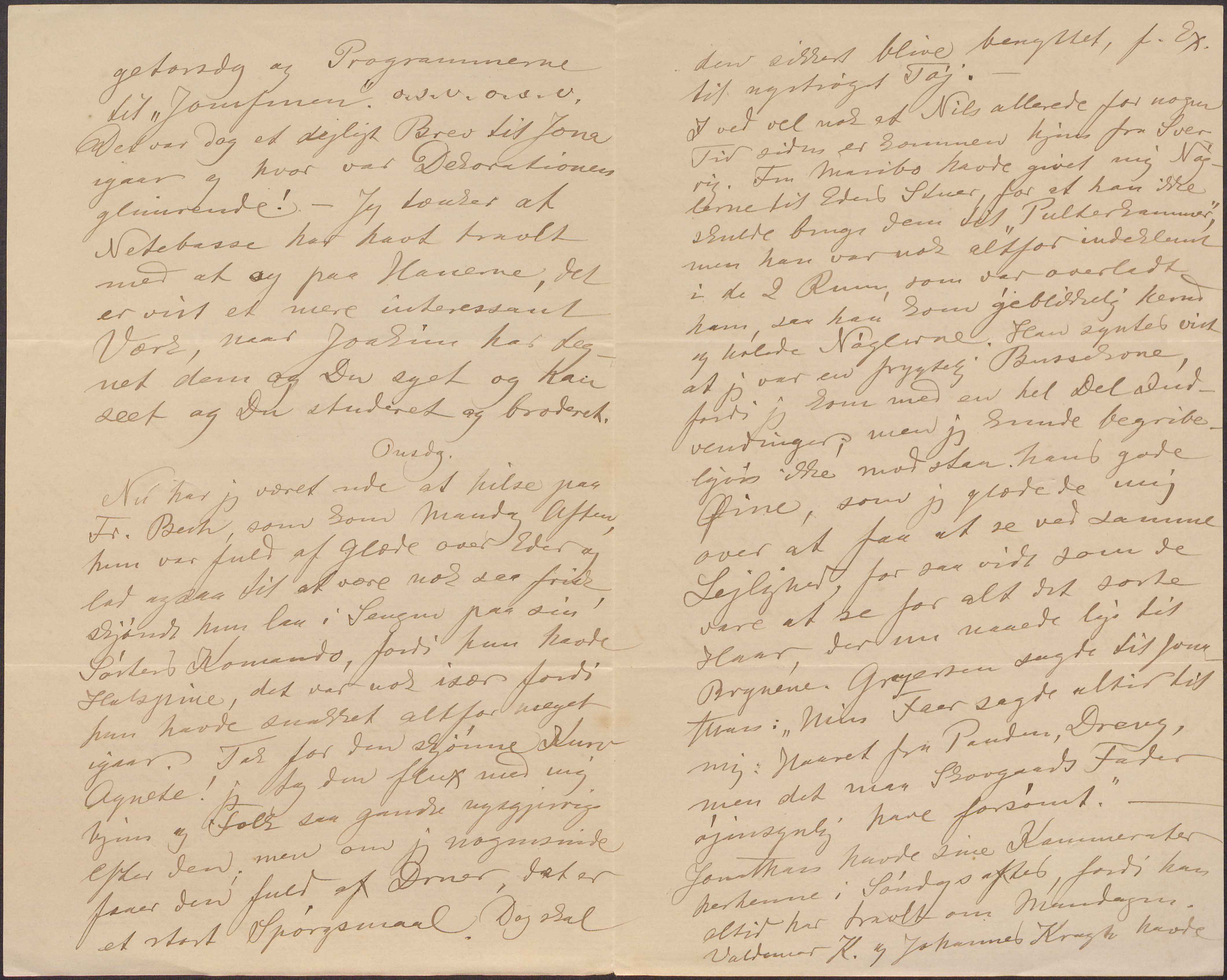 gjort Aftale om at spille noget for os, som de havde indøvet, men J. udeblev desværre. Det var imidlertid en lille Trøst at Herup-Petersen kunde spille de Smaating her laa; og tilsidst fik Jona sig en lille *Glunte sammen med Hans Jørgen og Fader. Nu havde Glunterne hvilet en lille Tid, fordi Harald B. er borte, hjemme i Præstegården i Vinter. Hans Jørgen seer helt aldrende ud med Skjæg paa og Thorvald Kornerup, som lige saa saare han kom hjem fra sin Marine-Soldatertur, fik en Ansættelse i statistisk Bureau er Værdigheden selv. Det var jo Aarsdagen efter hin Søndag, da Joakim var her for første Gang og I gik ud i Søndermarken og legede Tagfat. Nu har jeg nok ikke mere at fortælle, saa Gud i Vold!