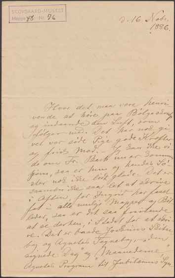 I ved vel nok at Nils allerede for nogen Tid siden er kommen hjem fra Sverrig. Fru Maribo havde givet mig Nøglerne til Eders Stuer, for at han ikke skulde bruge dem til ”Pulterkammer,” men han var nok altfor indeklemt i de 2 Rum, som var overladt ham, saa han kom øjeblikkelig herud og holede Nøglerne. Han syntes vist at jeg var en frygtelig Bussekone, fordi jeg kom med en hel Del Indvendinger; men jeg kunde begribeligvis ikke modstaa hans gode Øine, som jeg glædede mig over at faa at se ved samme Lejlighed, for saa vidt som de vare at se for alt det sorte Haar, der nu naaede lige til Brynene. Gregersen sagde til Jonathan: ”Min Faer sagde altid til mig: Haaret fra Panden, Dreng, men det maa Skovgaards Fader øjensynlig have forsømt.” – Jonathan havde sine Kammerater herhenne i Søndagsaftes, fordi han altid har travlt om Mandagen. Valdemar K. og Johannes Kragh havde