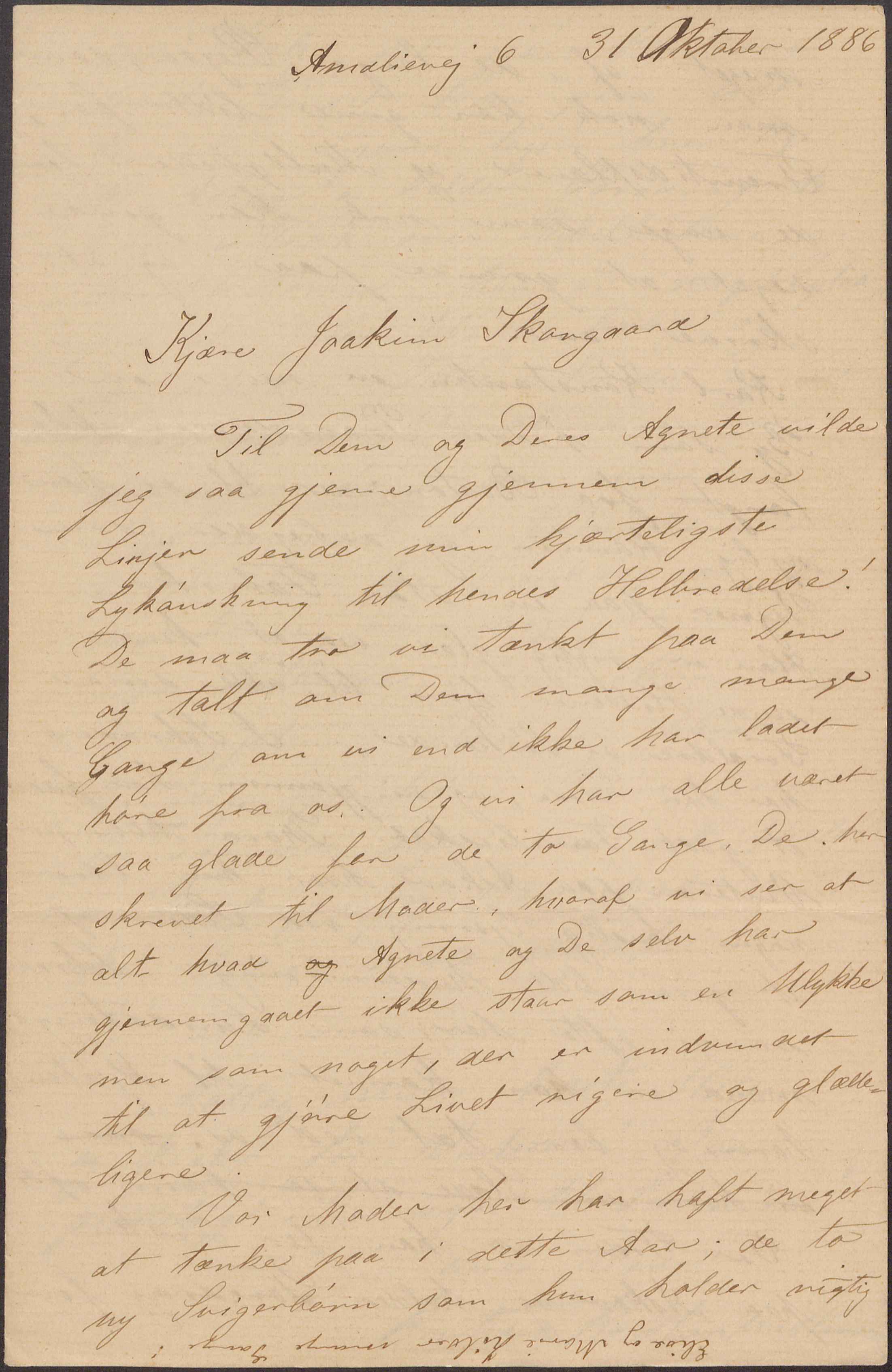 Kjære Joakim Skovgaard! Skjøndt De ikke har hørt det af mig selv, har De vel ikke tvivlet om, at jeg var i de forreste Rækker iblandt Deres gamle Venner til at glæde mig med Dem og takke Vor Herre for at De og Deres kjære Hustru |nu| med nye Kræfter kunde tage fat igjen og af fuldt Hjerte fryde Dem over al den Velsignelse Gud har givet Dem i hinanden. Medens De glæder Dem over Dejligheden derned, glemmer De dog vist ikke, at ogsaa her er yndigt at være og godt at sætte Bo.