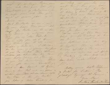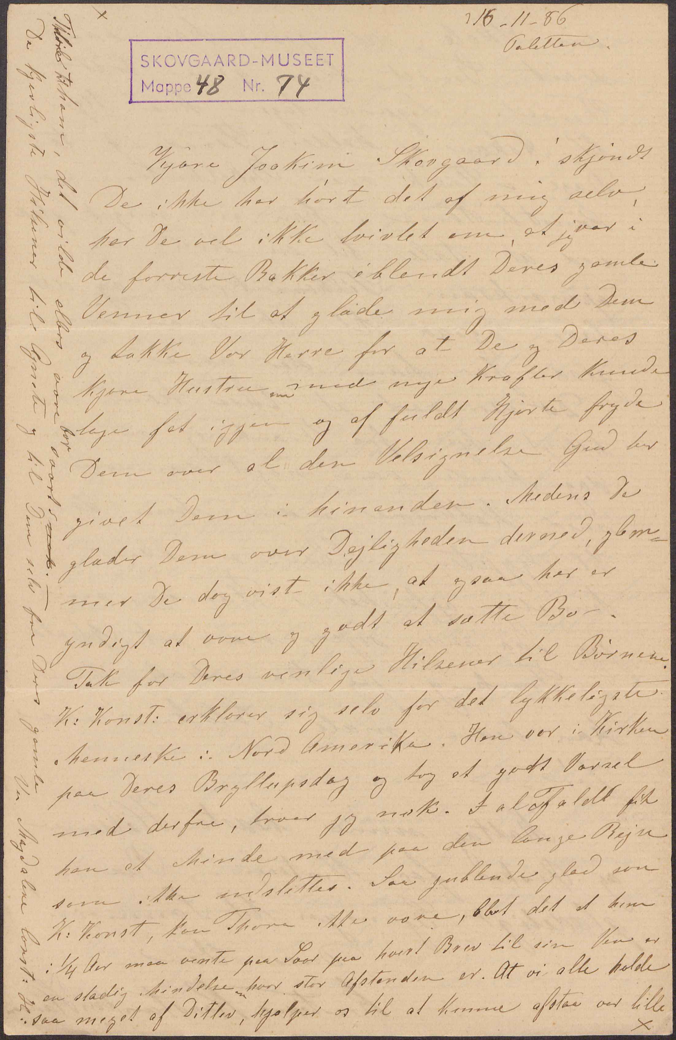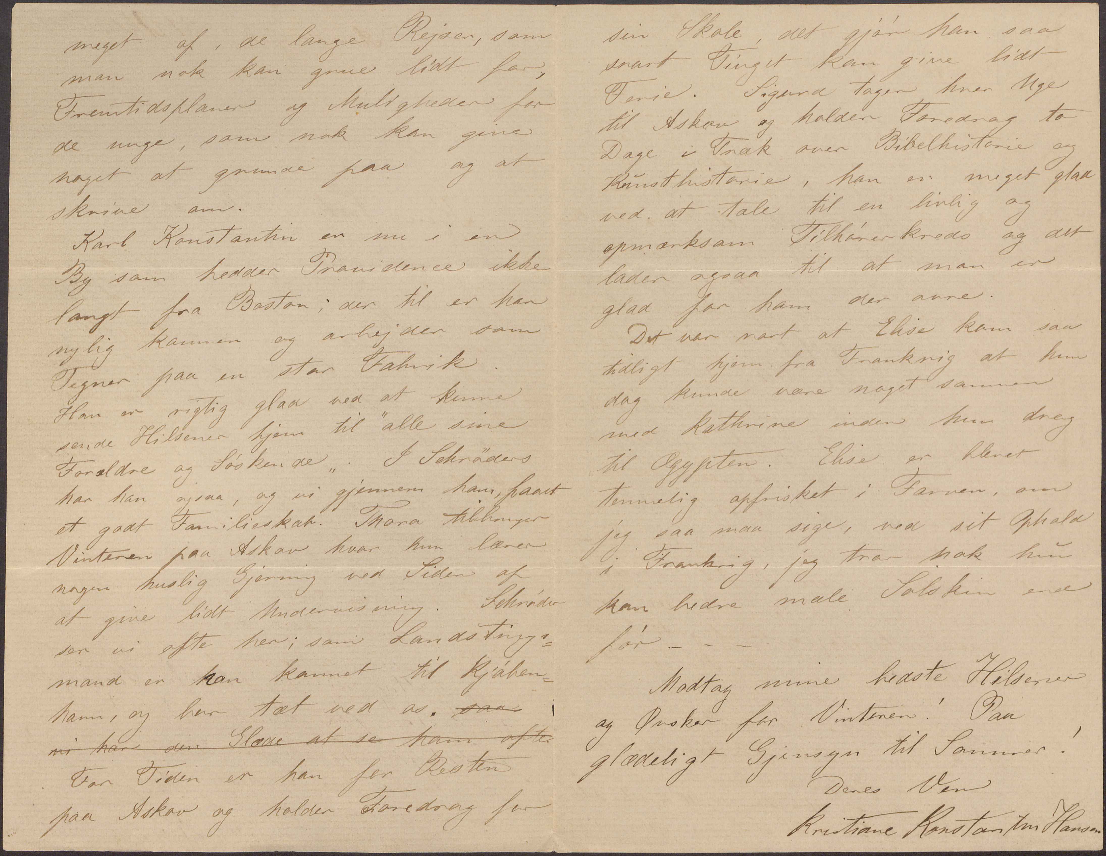 Tak for Deres venlige Hilsener til Børnene. K: Konst: erklærer sig selv for det lykkeligste Menneske i Nord Amerika. Han var i Kirken paa Deres Bryllupsdag og tog et godt Varsel med derfra, troer jeg nok. I al Fald fik han et Minde med paa den lange Rejse som ikke udslettes. Saa jublende glad som K: Konst:, kan Thora ikke være, blot det at hun i ¼ Aar maa vente paa Svar paa hvert Brev til sin Ven er en stadig Mindelse |om|, hvor stor Afstanden er. At vi alle holde saa meget af Ditlev, hjælper os til at kunne afstaa vor lille*
