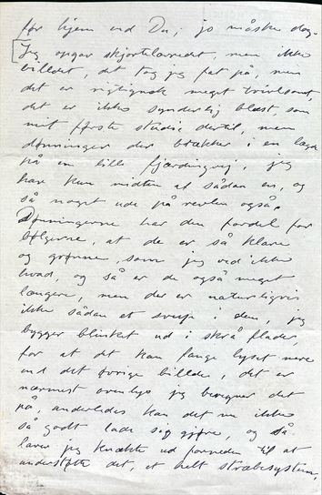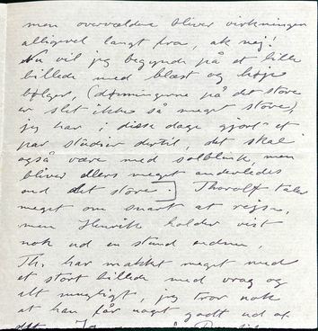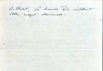 Kære Joakim. Jeg har rigtignok ikke gjort, hvad Du bad mig, nemlig at sende dig et brevkort og berette, at jeg ikke har fået Dit brev, men jeg havde andre at skrive til, og jeg gik ud fra, at Du af mit andet brev, måtte kunde forstå, at jeg ikke havde fået det. Altså brevet har jeg ikke fået, og ved intet om det der er på færde med Bindesbøll, men to brevkort har jeg fået fra Dig med besked om ”Fremtiden” i det ene, og jeg har skrevet til Engelsted og fået svar igen, han besørger billedet, men siger i parentes at han synes prisen er lav, han lader Cathrine udfylde en blanket som hører til; en fødsels atest skal medfølge, men den kan hun vel nok skaffe. Hvad det angår at åbne kasse, så kan Du vist lige så godt gjøre det som jeg, tænker jeg, for jeg kommer troligvis ikke