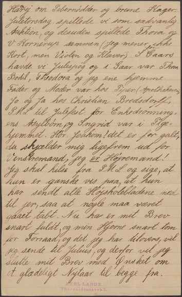 Ha|n|rej om Pebernødder og brune Kager. Juletorsdag spillede vi som sædvanlig Auktion, og desuden spillede Thora og V Kornerup sammen (jeg mener ikke Kort, men Violin og Klaver). I |for|Gaars havde vi Julespøg og i Gaar var Thora Bodil, Theodora og jeg ene hjemme. Fader og Moder var hos Piper (Apothekeren), Jo og Ja hos Christian Bredsdorff, PML til Julefest for Enkedronningens Asylbørn, og Ingrid var i Pigehjemmet. Hør Joakim! det er for galt, du skjælder mig ligefrem ud for Venstremand, jeg er Højremand! Jeg skal hilse fra PML og sige, at hun er ganske vis paa, at hun har sendt alle Højskolebladene ned til jer, saa at nogle maa været gaaet tabt. Nu ha er mit Brev snart fuldt, og min Hjerne snart tom for Forraad, og det jeg har tilovers, vil jeg sende til Julius, og derfor vil jeg slutte mit Brev med Ønsket om et glædeligt Nytaar til begge fra