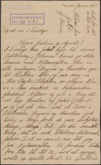 I Fredags* kom Jakob lige til vores Juletorsdag; Johanne kunde jo ikke komme med. Nytaarsaften blev vi alle undtagen Ingrid og Karoline oppe til Klokken tolv, og saa sang vi ”Hov Vægter! Klokkken er slagen tolv.” o.s.v. Saa ønskede vi hinanden glædeligt Nytaar og gik i Seng, det vil sige Jonathan og Jakob (forkortet jo og ja) gik hen med et Brev i Postkassen. Ingrid og Karoline gik tidlig i Seng, fordi de vare forkjølede Mange, Mange, Tak! for den smukke Pung, det er nok Italiens Nationalfarver. Det er sandt, nu løb jeg fra Nytaarsaften. Vi fordrev Tiden fra The til Kl 12, med at synge, spille og spille Kort. Vi spillede